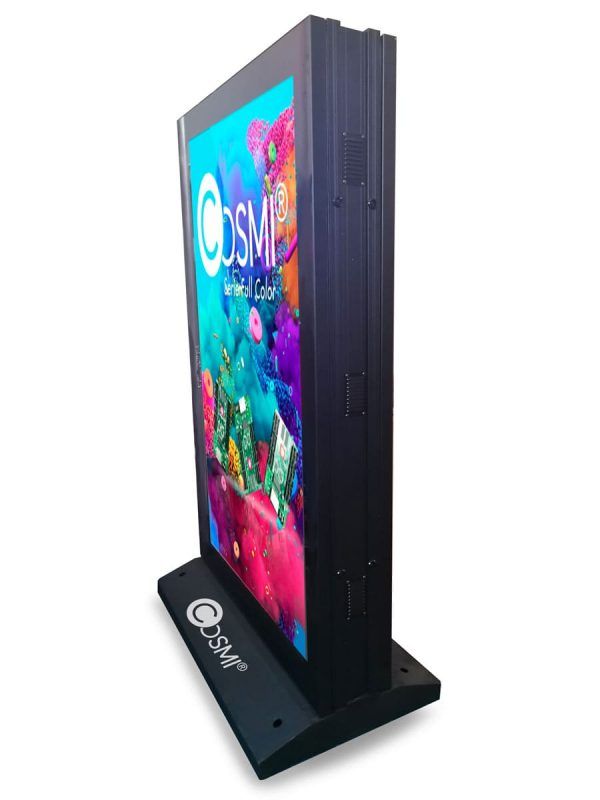 Los mupis Cosmi full color P5 para exterior, no solo cuentan con un recubrimiento propio de cualquier obra de arte, sino que en su interior la vanguardia y tecnología se unen para crear una pantalla modular de altisimas prestaciones. Su distancia entre leds le permite una visualización óptima a partir de distancias medias. Su brillo e intensidad de color le propocionan la seguridad de ser visualizada la publicidad perfectamente tanto de día como de noche.